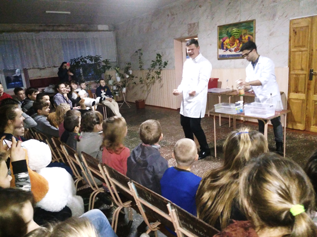 Проте великою несподіванкою для них стало шоу Великих Хіміків Аргона та Радона, які розповідали різні історії з життя Великої Країни Хімії. Дітлахи із захопленням слухали цікавинки про різні хімічні реакції, дізнавалися звідки береться газ, що таке дирижабль, чи пече рідкий азот, скільки важить кулька, складали та розв’язували арифметичні задачі, спостерігали за хімічними дослідами Великих Хіміків.