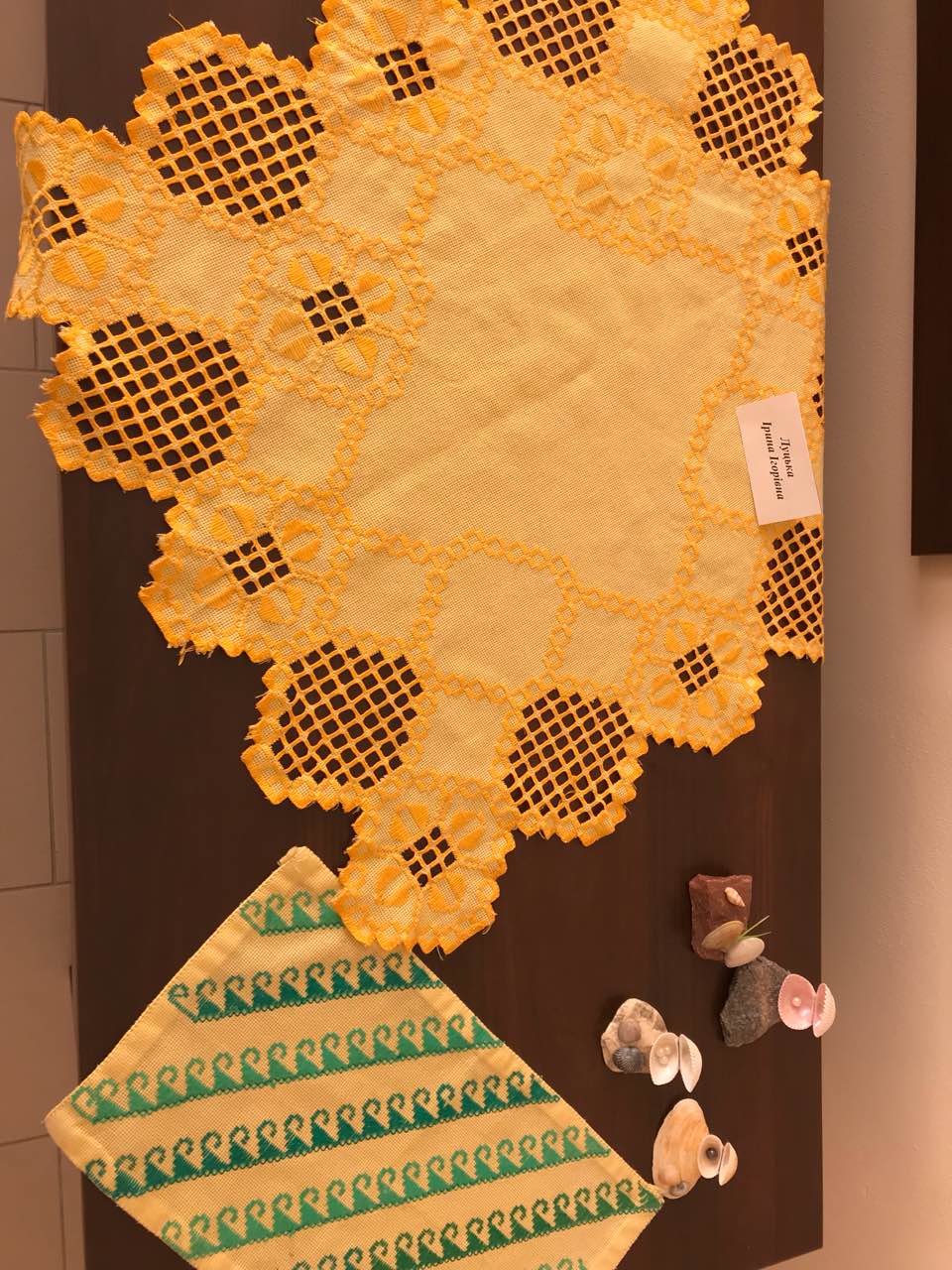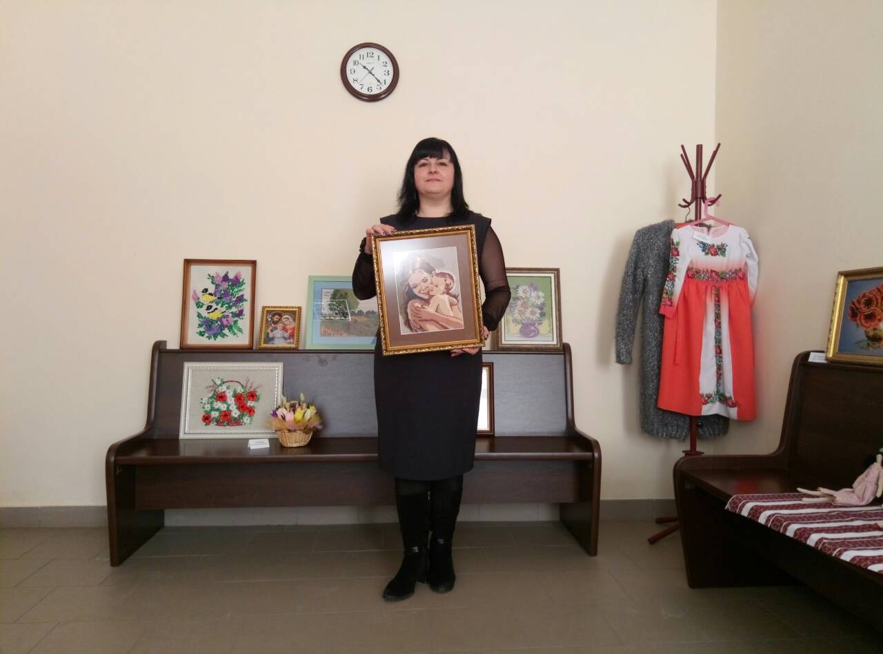 В експозиції представлені вишиті картини, вишиті ікони, в’язані вироби, вироби з бісеру, вишиванки, рушники та серветки. Поряд з картинами також представлені авторські ляльки.