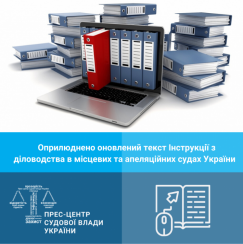 Державна судова адміністрація України оприлюднила наказ від 24 грудня 2019 року №1196 «Про внесення змін до Інструкції з діловодства в місцевих та апеляційних судах України» з додатком відповідно до якого затверджуються зміни до Інструкції з діловодства в місцевих та апеляційних судах України, затвердженої наказом ДСА України від 20.08.2019 № 814, які набирають чинності з 1 січня 2020 року.