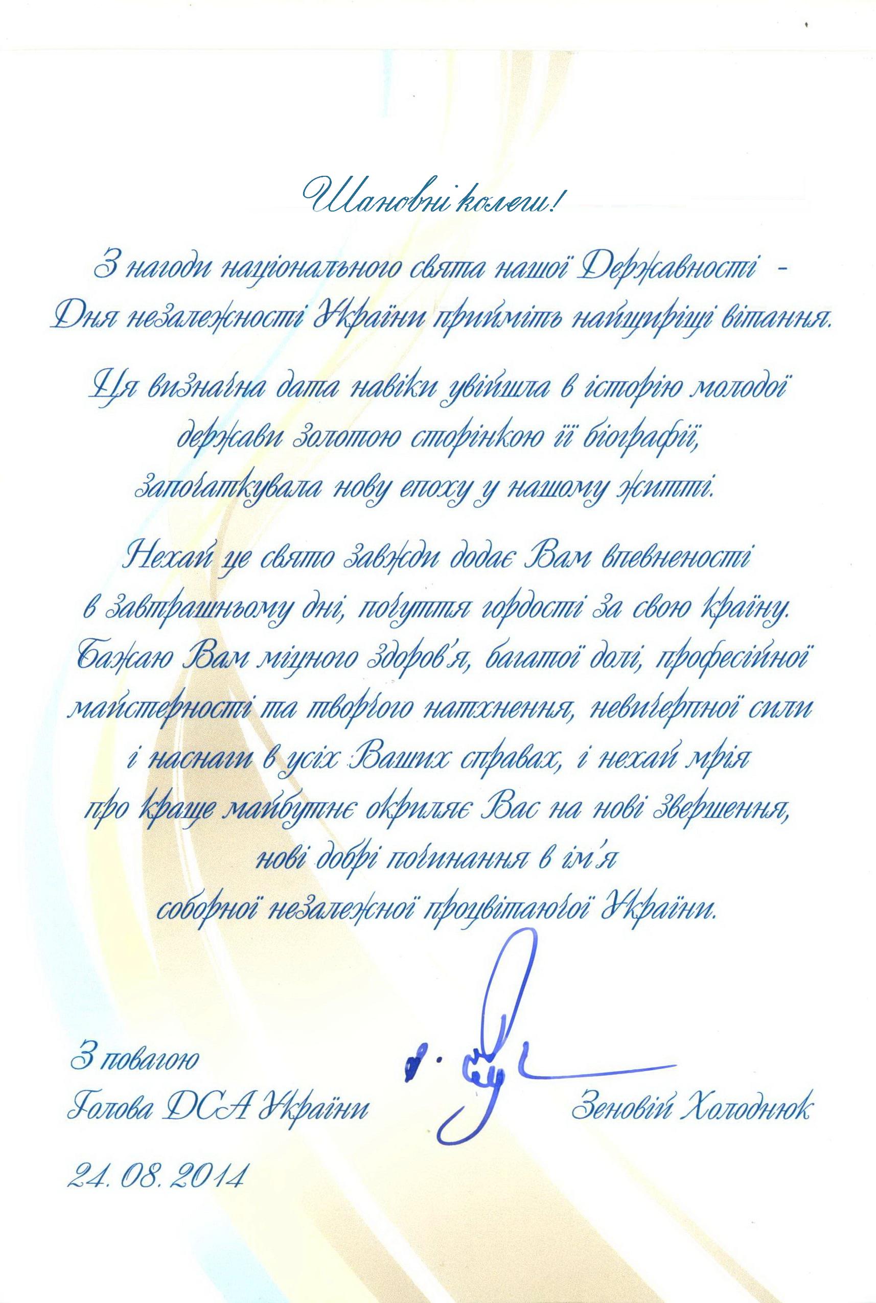 Привітання Державної судової адміністрації України з нагоди Дня незалежності України
